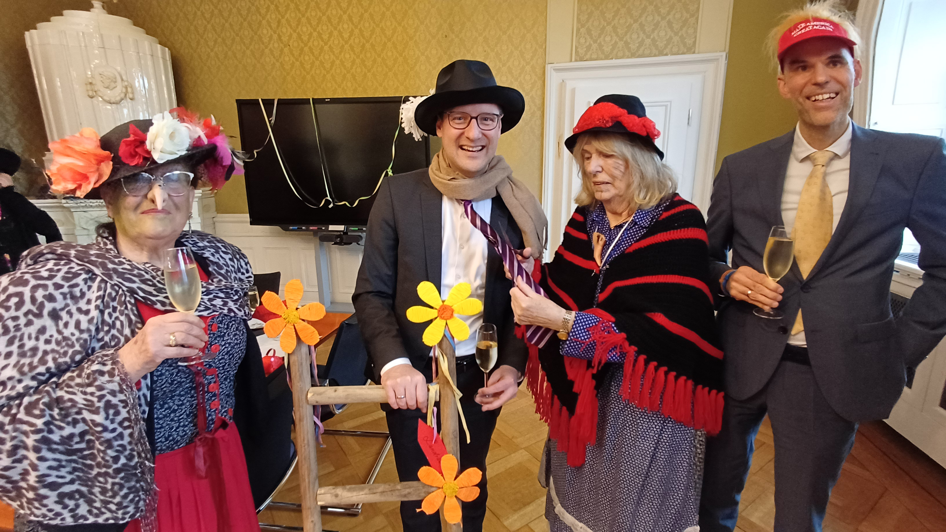 Bald-Landrat Just will offenbar auf seine Hutzeln aus Sulzbach auch im neuen Amt nicht verzichten und lud die Besucherinnen für Altweiberfastnacht im nächsten Jahr aufs Heidelberger Landratsamt ein. Nun wollen sie sich beraten, ob sie auch wirklich ins „Heidelberger Ausland“ reisen…