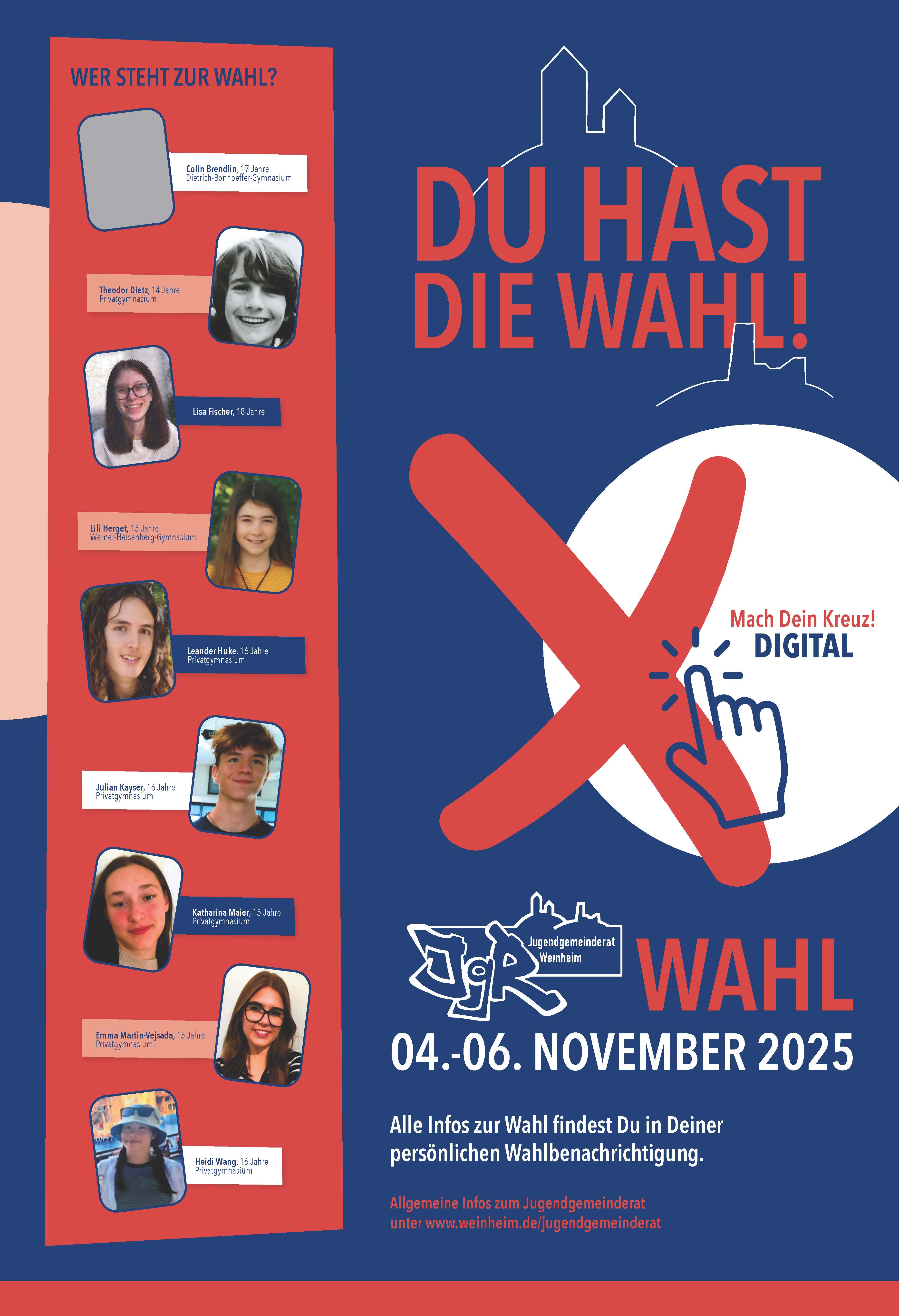 Seit 2013 vertritt der Jugendgemeinderat die Interessen junger Weinheimerinnen und Weinheimer gegenüber dem Oberbürgermeister, dem Gemeinderat und seinen Ausschüssen. Zudem hat er bei allen jugendrelevanten Themen ein festes Rederecht im Gemeinderat. Gewählt wird das 12-köpfige Gremium alle zwei Jahre von Jugendlichen zwischen 14 und 19 Jahren.