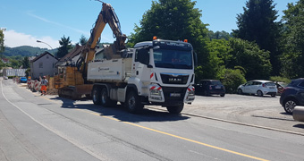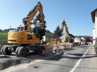 Der Kanalgraben wird, wie bisher, abschnittsweise mittels einer provisorischen Asphaltschicht geschlossen. Voraussichtlich ab Mitte Juli wandert die Kanalbaustelle in den Bildstockweg, um dort noch ca. 50 m Kanal auszutauschen. Dann wird im Bereich der Tankstelle mit den Straßenbauarbeiten unter halbseitiger Sperrung mit Ampelschaltung begonnen.