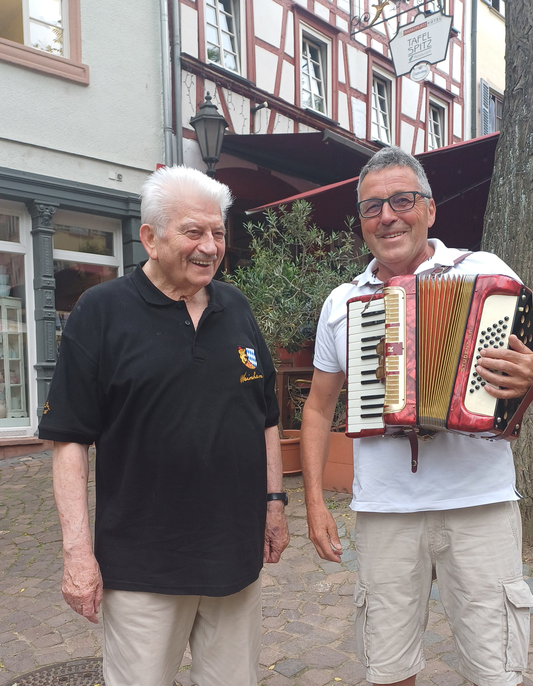 Die Sprichwörterführung durch die Weinheimer Altstadt ist eine Spezialität des Weinheimer Stadtführer-Urgesteins Franz Piva. Jetzt, am 9. Oktober, 17 Uhr, wird diese „Katze im Sack“ noch einmal besonders inszeniert: An Pivas Seite begleitet der frühere Weinheimer Bürgermeister Dr. Torsten Fetzner mit seiner Gitarre die Gruppe und weiß zu jedem Kleinod und jeder Anekdote auch ein passendes Lied. Piva und Fetzner sind ein eingespieltes Team. Die Teilnehmer sind zum Mitsingen eingeladen. Wie immer bei ihren Musikalischen Stadtführungen verlangen sie keinen Kostenbeitrag – bitten aber um Spenden für einen guten Zweck. Diesmal ist es die Alwine-Stiftung „In Würde altern“. Wer spendet, darf sogar an einem Sekt-Empfang an historischem Ort teilnehmen: Im Büdinger Hof in der Judengasse.Treffpunkt an diesem Donnerstag, 9. Oktober, 17 Uhr, ist der Marktplatzbrunnen vor der Tourist-Info und dem Alten Rathaus mit dem Wappen der Stadt. Torsten Fetzner stimmt dort ein „Hoch auf dem gelben Wagen“ an. Am Deutschordenshaus am Amtshausplatz mit Blick auf Windeck und Wachenburg plaudert Piva über die Sprichwörter, die Vögel und Frösche erwähnen – gemeinsam gesungen wird: Die Vogelhochzeit. So geht es schwadronierend und musizierend weiter durch die Judengasse zu jenem Büdinger Hof, wo Hausherr Uwe Kohl zum Umtrunk persönlich das „Gerberbächerlied“ zum Besten gibt, Das Kerwehaus in der Münzgasse wird zur „Kleinen Kneipe in unserer Straße“. Man besichtigt die Ulner Kapelle mit „Sierra Madre“ und am Hutplatz, wo im Mittelalter eine jüdische Synagoge stand, erklingt zum Abschluss das „Badner Lied“.Die Führung dauert rund Stunden. Anmeldung unter tourimus@weinheim.de oder 06201-82 610.