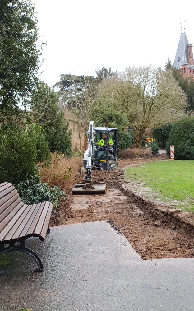 Daher war es eine Punktlandung, als am Dienstagmorgen im Schlosspark der kleine Bagger des Baubetriebshofs in den Fußgänger-Weg biss, der am skulpturartigen Eibenbusch in den Schlosspark führt – es ist einer der Hauptwege von der Stadt und der Alten Zeder zur großen Wiese, dem Weiher und dem Exotenwald. Der Weg barg schon eine Weile etliche Stolperstellen, war für Menschen mit eingeschränkter Mobilität ein echtes Hindernis. Jetzt wird er im vorderen Bereich neu angelegt, ein solider Unterbau unter dem Asphalt sorgt dafür, dass der Weg lange in gutem Zustand bleibt. Und dank des Wetters sollte es schnell gehen, am Wochenende soll der neue Weg in den Frühling schon wieder begehbar sein.