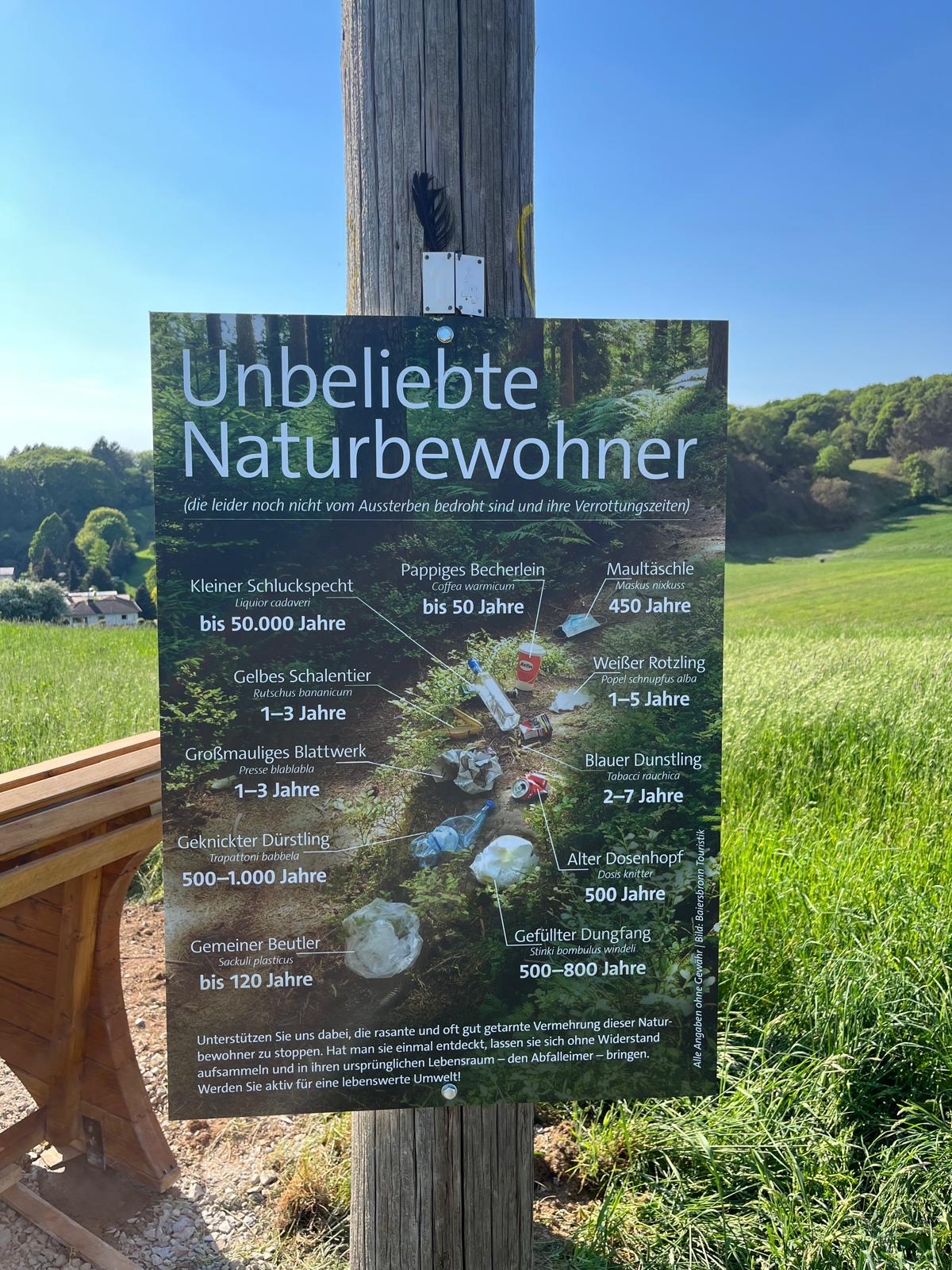 Auf dem Höhenrücken des Weges stehen eine Liegebank, eine Sitzgarnitur mit Mülleimer sowie ein Hinweisschild über Müll und seine Haltbarkeit in der Natur. Trotzdem landen dort immer wieder Abfälle, die offensichtlich aus vorbeifahrenden Autos geworfen werden. Besonders ärgerlich sei zudem eine kleine Ausbuchtung am Wegesrand, die regelmäßig unerlaubt als Parkplatz genutzt werde.